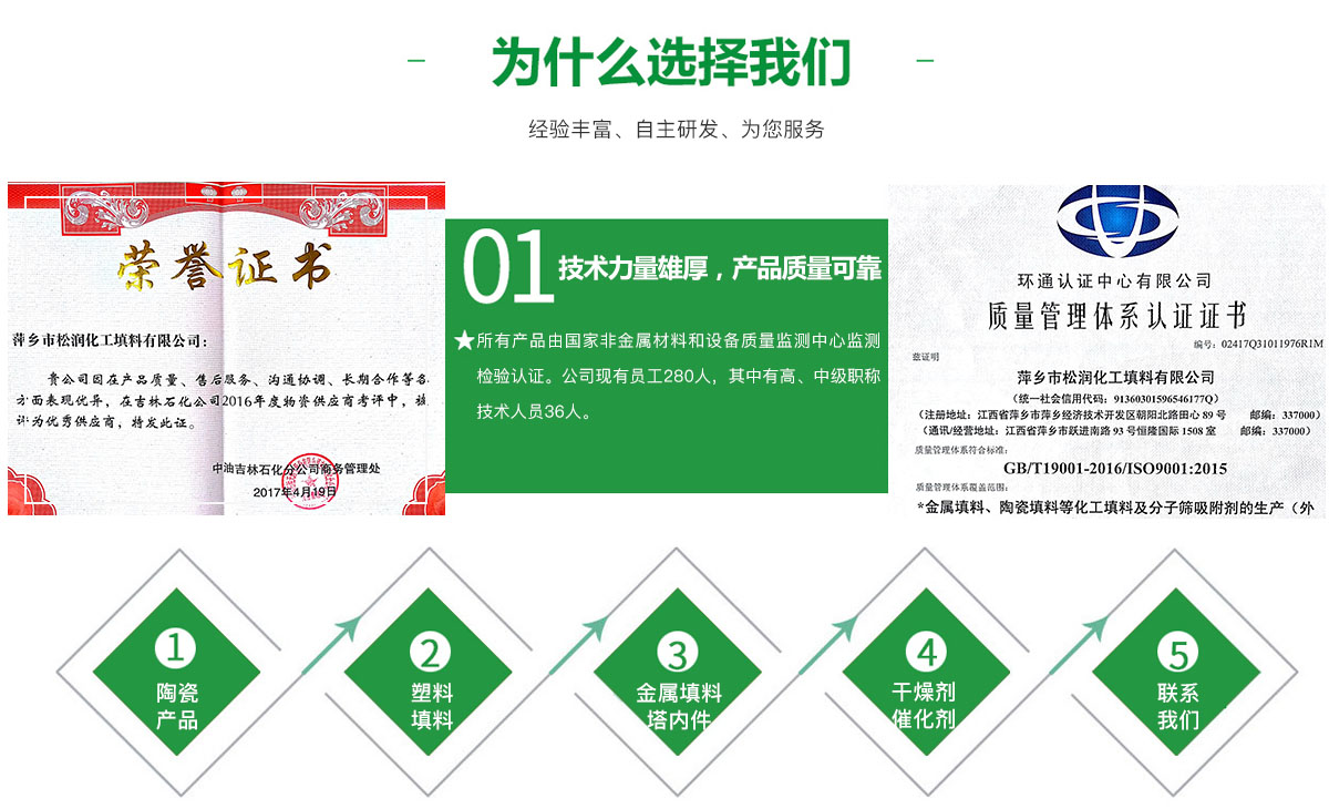 - 萍鄉市松潤化工填料有限公司位于江西省萍鄉市國家經濟開發區西區,是專業生產、經營陶瓷、聚丙烯、金屬填料、塔內件、水處理濾板、濾管、濾料、瓷球、分子篩、催化劑、活性炭、蜂窩陶瓷、瓷質耐磨托輥等系列產品的民營企業。所有產品由國家非金屬材料和設備質量監測中心監測檢驗認證。公司現有員工280人,其中有高、中級職稱技術人員36人。工藝先進,技術力量雄厚,產品質量可靠,配... ...